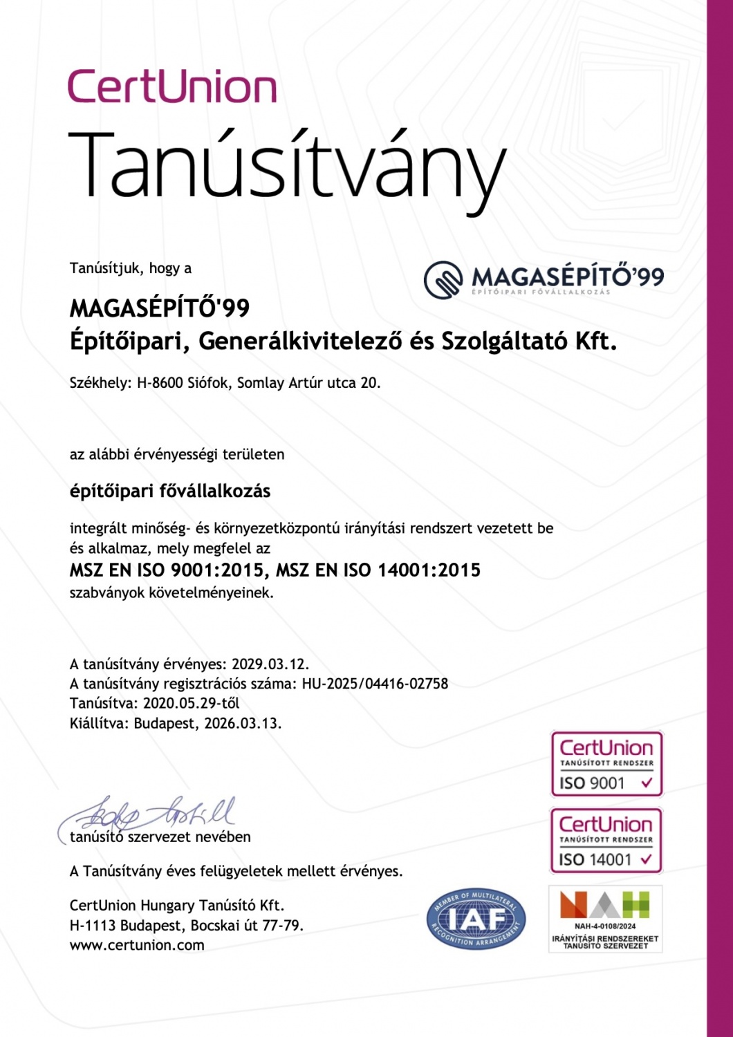 Tanúsítványok